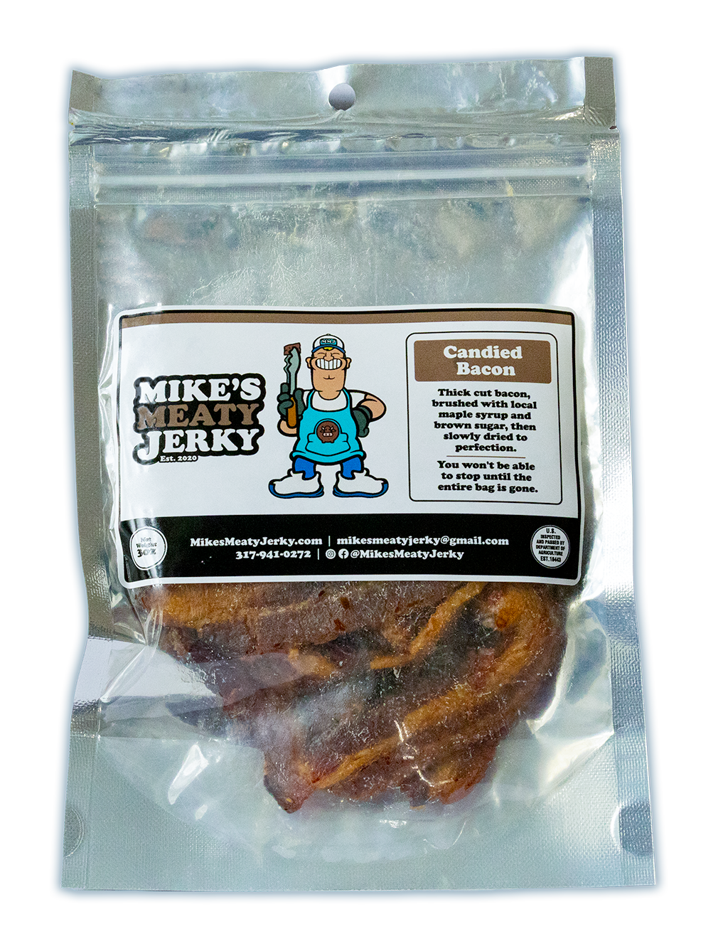 Tocino cortado grueso, untado con jarabe de arce local de Indiana y azúcar moreno, y luego horneado lentamente hasta alcanzar la perfección. No podrás parar hasta que se acabe toda la bolsa.