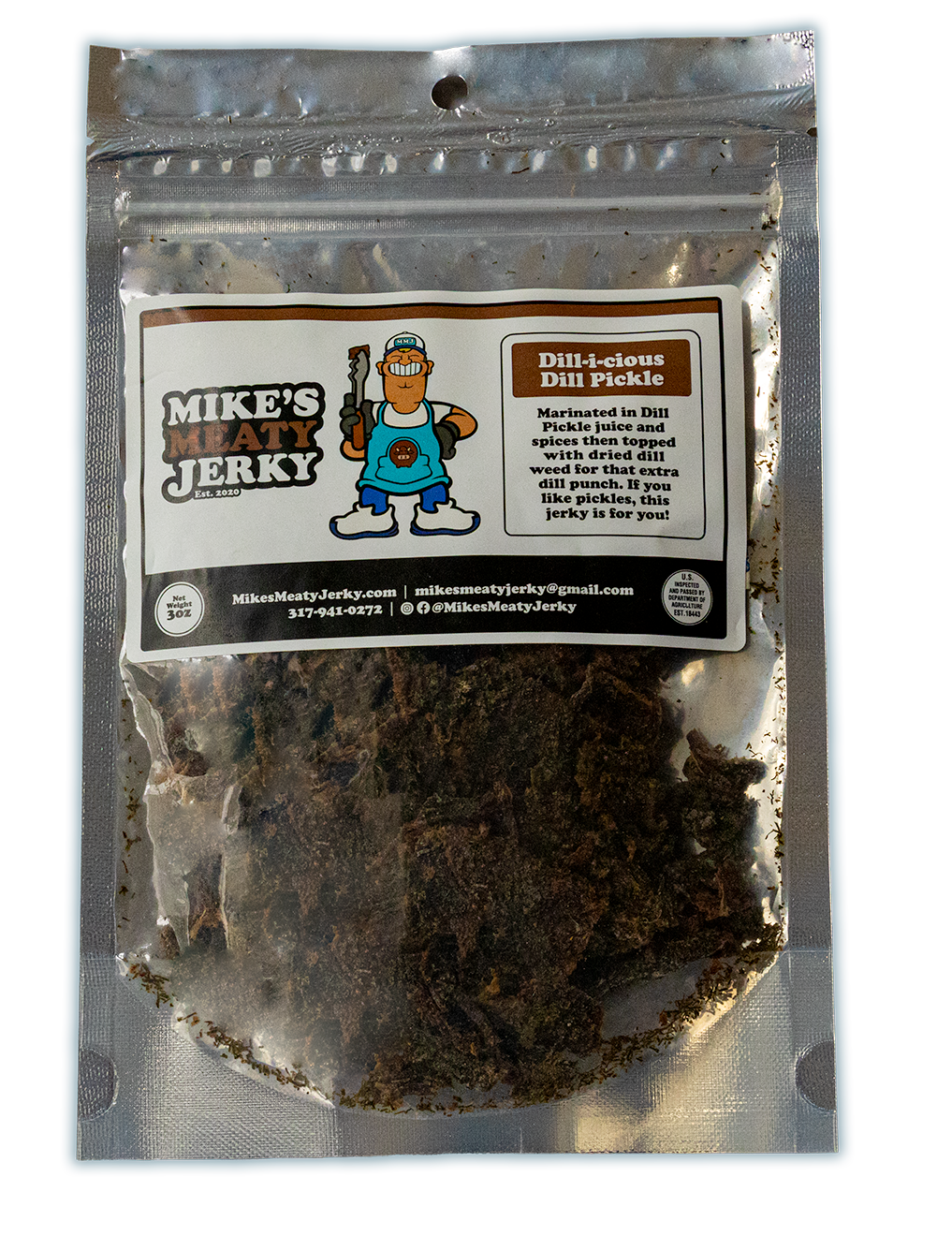 Marinated in Dill Pickle juice and spices then topped with dried dill weed before dehydrating for that extra dill punch. If you like pickles, this jerky is for you!
